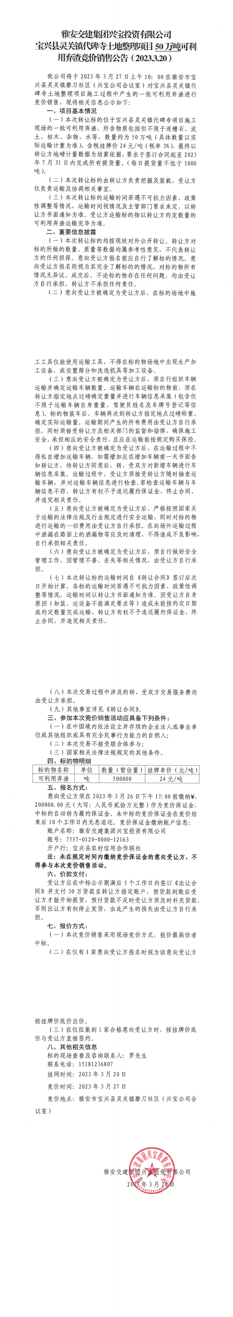 雅安交建集團興寶投資有限公司靈關(guān)鎮(zhèn)代碑寺土地整理項目30萬噸可利用棄渣競價銷售成交公告(2023.3.20)