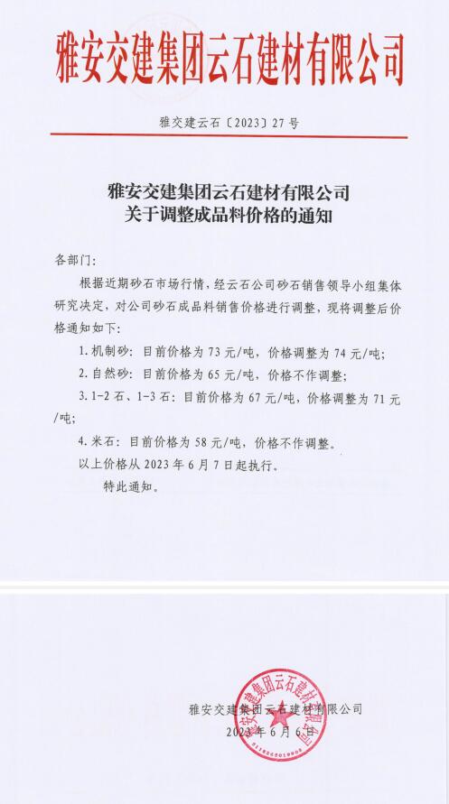 雅安交建集團(tuán)云石建材有限公司成品料價(jià)格調(diào)整公告(2023-06-06)
