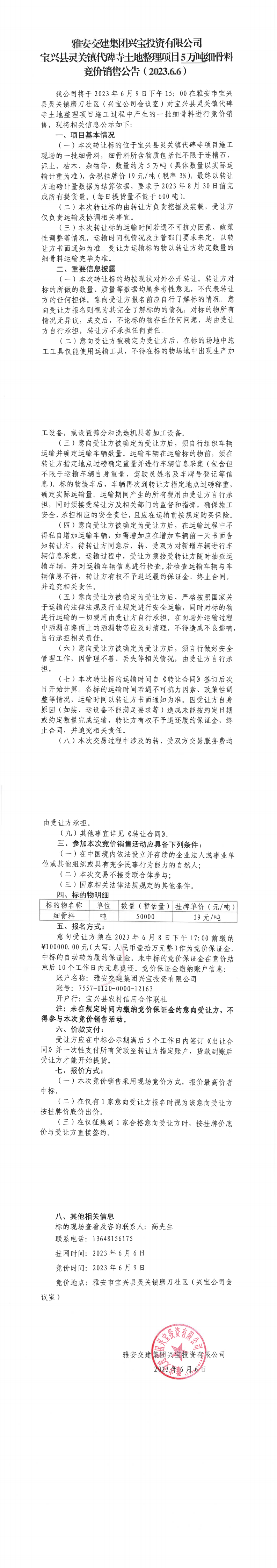 雅安交建集團興寶投資有限公司寶興縣靈關(guān)鎮(zhèn)代碑寺土地整理項目5萬噸細骨料競價銷售公告(2023.6.6)