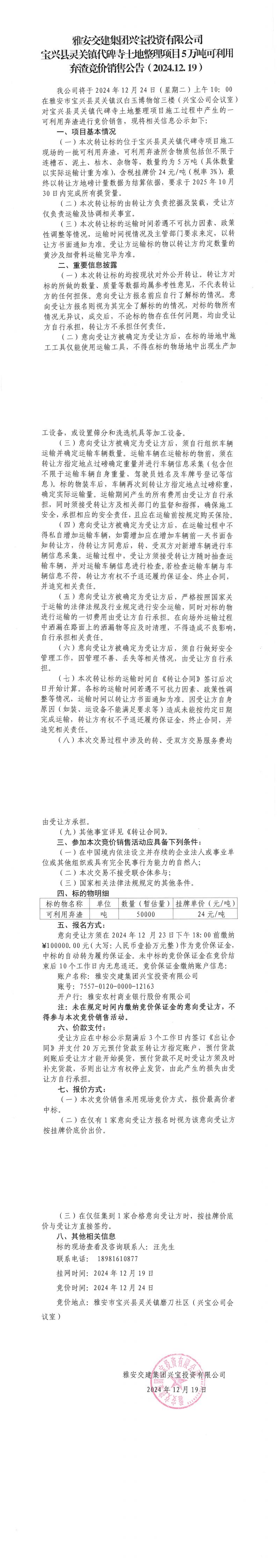 雅安交建集團(tuán)興寶投資有限公司靈關(guān)鎮(zhèn)代碑寺土地整理項目5萬噸可利用棄渣競價銷售公告(2024.12.19)
