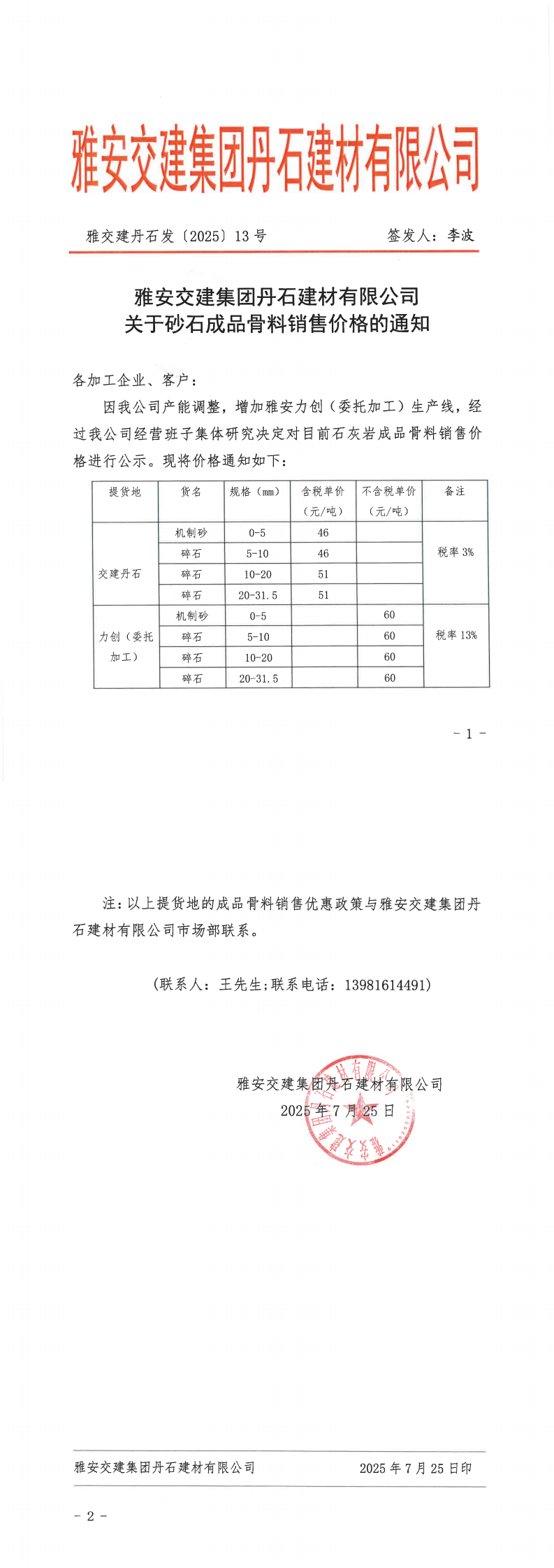 雅安交建集團(tuán)丹石建材有限公司關(guān)于調(diào)整砂石成品骨料價格的通知(2025.7.28)